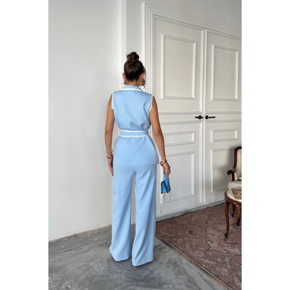 Ensemble décontracté bleu 2 pièces : gilet et pantalon avec détails de passepoil et ceinture, taille XXS, longueur au-dessus du genou