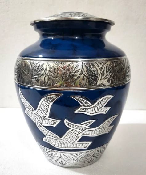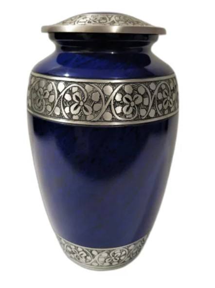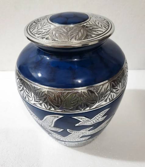 Urnes de crémation en laiton de frontière de conception en relief de couleur bleue pour les cendres adultes humaines urne commémorative de crémation pour les cendres humaines