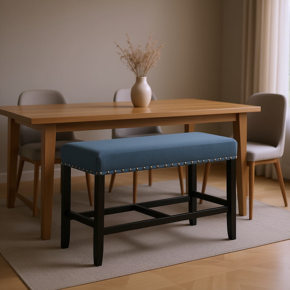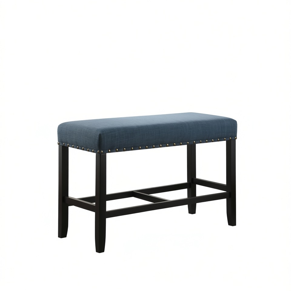 Banc de salle à manger bleu à hauteur de comptoir avec garniture cloutée, mobilier de salle à manger moderne