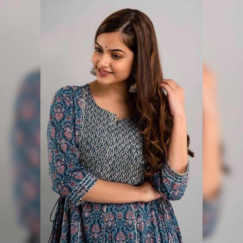 Blue Floral Cotton Anarkali Kurti Dress For Women Daily Casual Wear