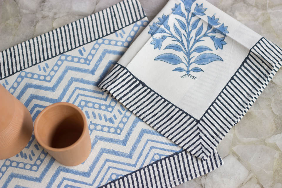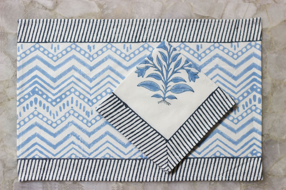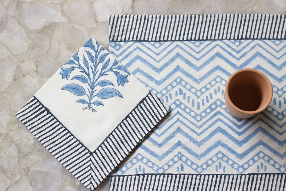 Ensemble de 6 serviettes de Table et 6 tapis à motif Floral, en coton indien, avec impression à la main, couleur bleue, 1 pièce