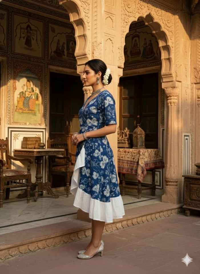 Robe d'été en coton à imprimé floral numérique bleu, taille naturelle, ourlet à volants, col en V, tenue ethnique bohème artisanale indienne pour femme
