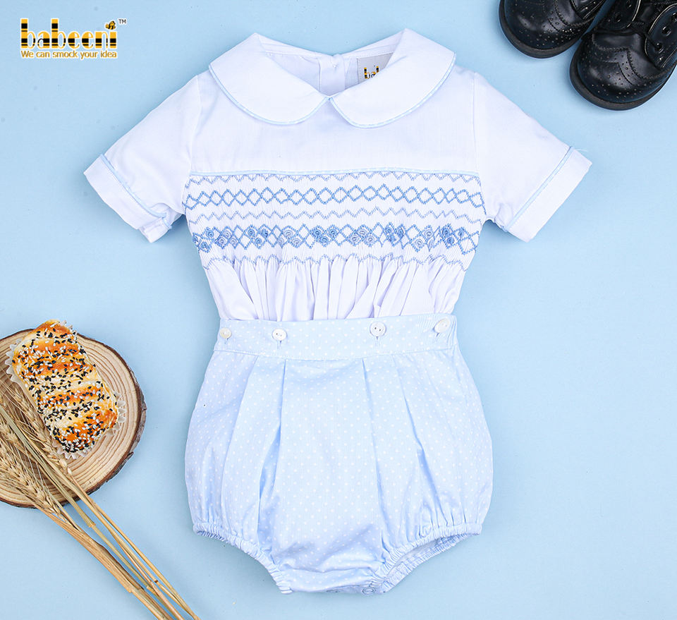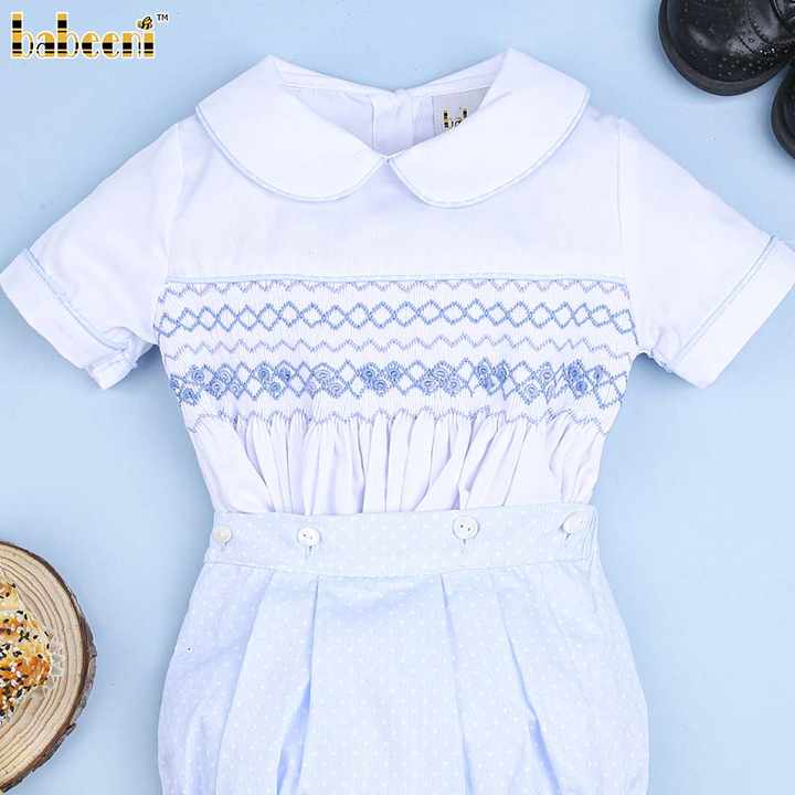 Bleu Géométrique Smocking Boy Set ODM personnalisé Broderie En Gros Fabricant En Gros Smocké Vêtements-BB2411