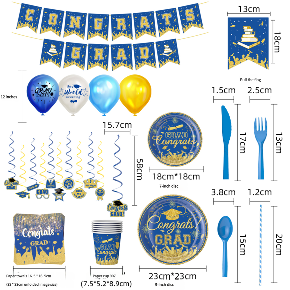Vaisselle jetable en papier bleu or pour les fêtes de remise de diplômes, décorations à thème saisonnier transfrontalières, y compris plateau, gobelet, serviette, 4 couleurs