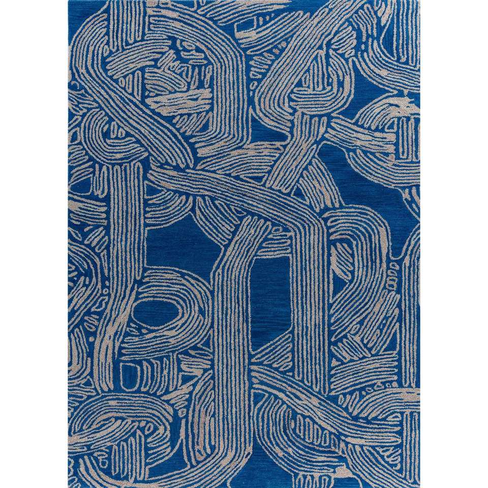 Tapis en laine et viscose bleu tufté à la main Tra-1479 - Motif abstrait pour entrée, couloir, salon - Rectangulaire 9x12 - Épaisseur 10 mm