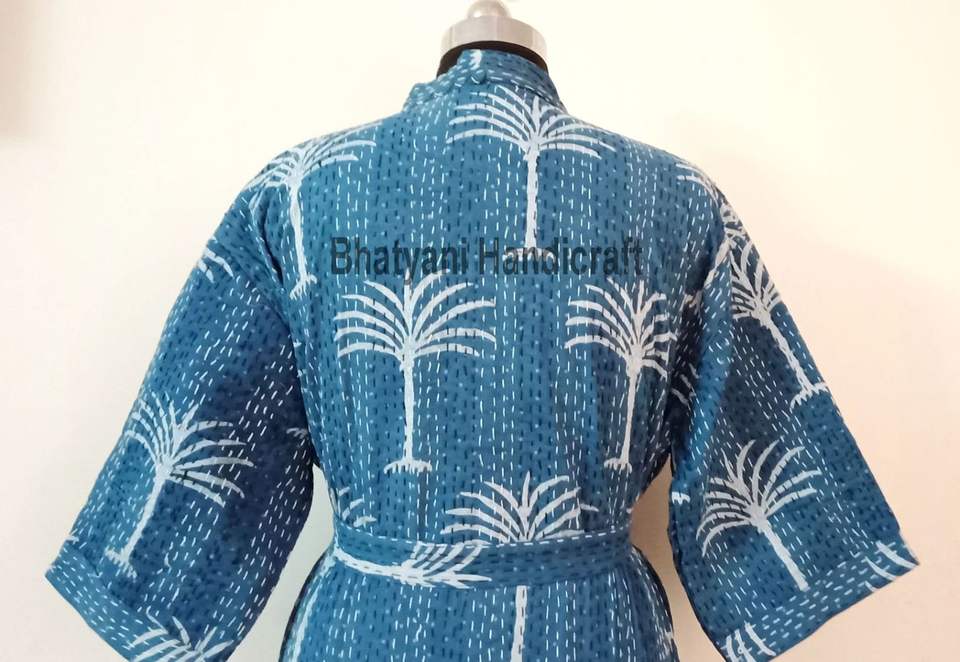 Bleu Indigo Kantha veste pour femmes longue coton matelassé Robe indienne avec motif floral hiver plage porter Kimono