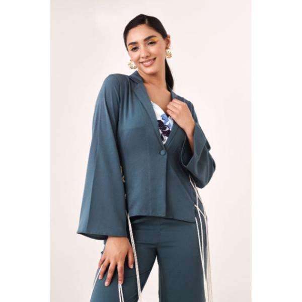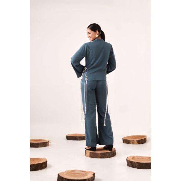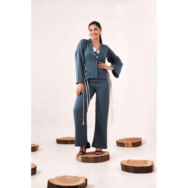 Ensemble pantalon et boléro bleu à lacets pour femme, ensemble coordonné élégant, tenue deux pièces avec détails en dentelle, look tendance, coupe confortable