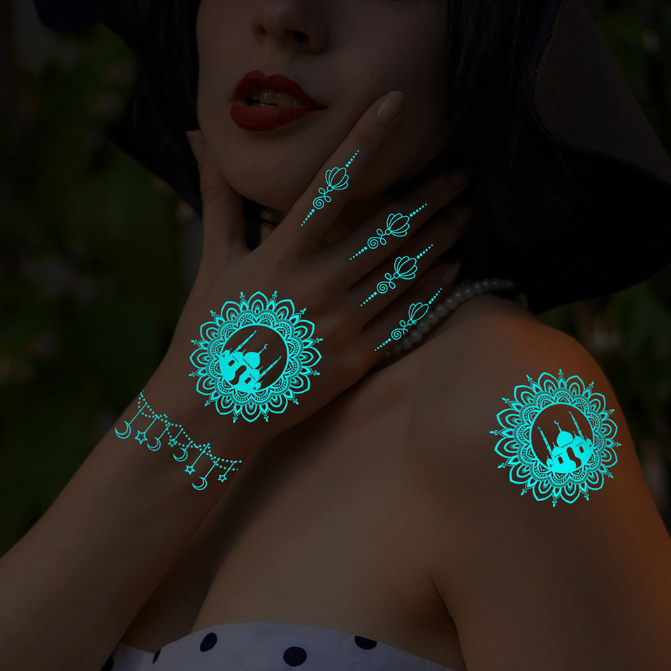 Autocollant de tatouage temporaire lumineux bleu en forme de pissenlit flocon de neige, tatouage sexy tribal en dentelle de lotus, tatouage lumineux dans le noir, design de tatouage