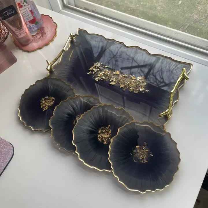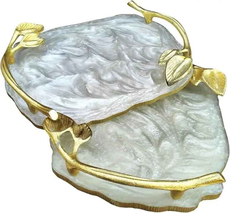 Plateau de service en résine Blue Ocean Geode avec bord doré, style agate, plateau en résine, organisateur de bijoux de luxe, décoration de table basse