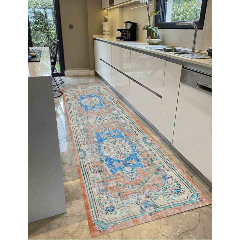 Tapis à motifs bleus et oranges : Tapis antidérapant de style Oushak, tapis en chenille
