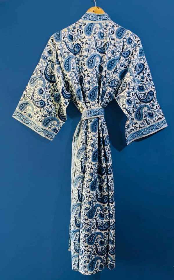 Robe kimono en coton imprimé à la main avec motif paisley bleu, style bohème, robe de détente pour femmes