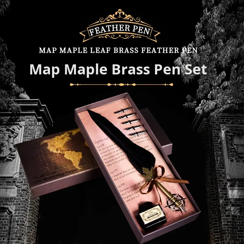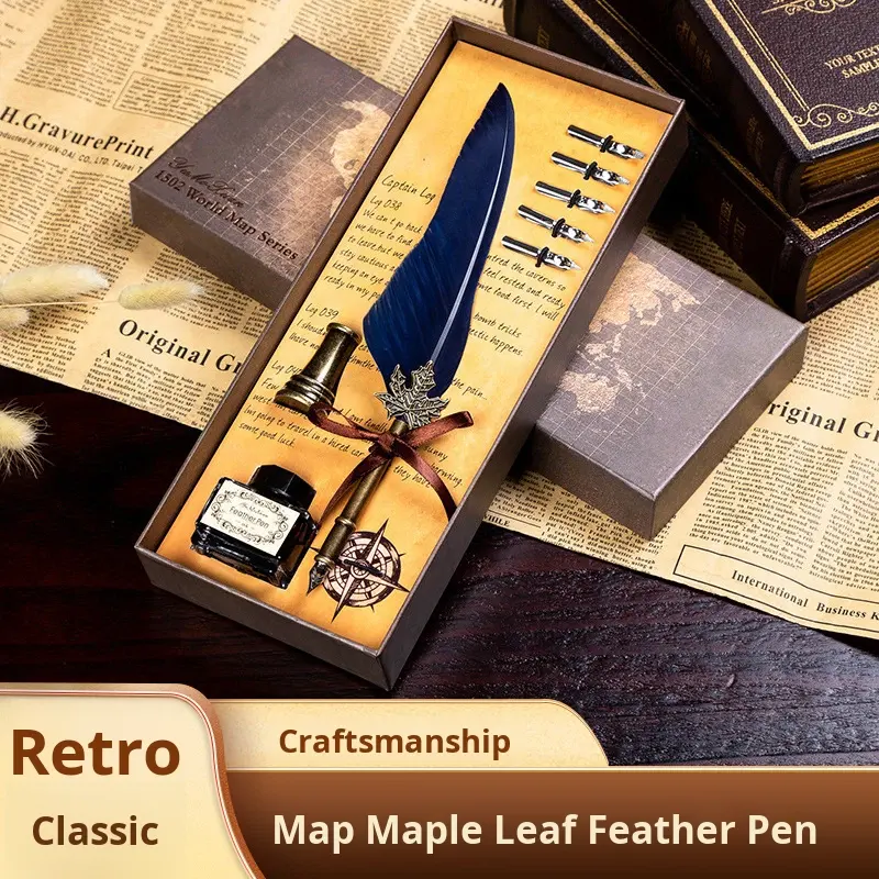 Stylo plume rétro en forme de plume de paon bleu, design feuille d'érable, ensemble de stylos plume avec bouteille d'encre et support de carte, coffret cadeau