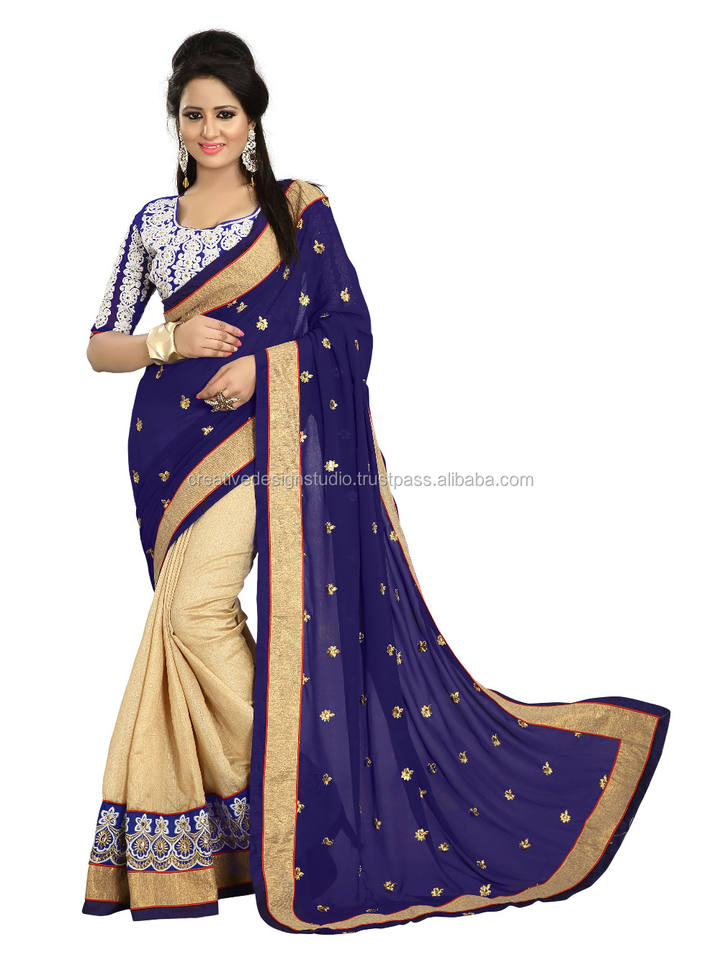 Vêtements de fête en Polyester, bleu marine, broderie, Saree