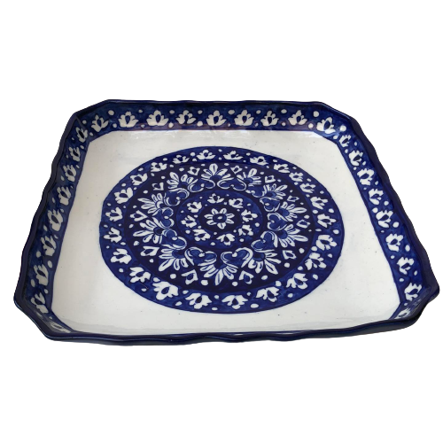 Plateau de service carré en céramique peint à la main en poterie bleue
