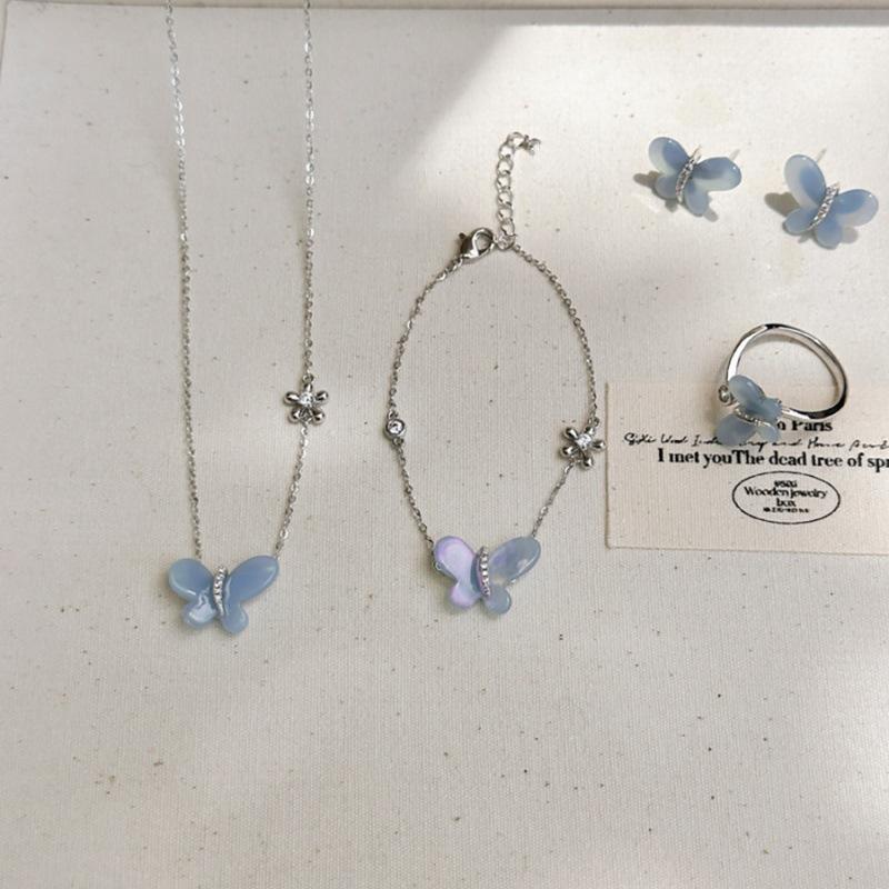 Ensemble de bijoux papillon en résine bleue avec incrustation de zircon pour femme, cadeau pour occasion spéciale, collier, bracelet, boucles d'oreilles, bague en alliage de zinc