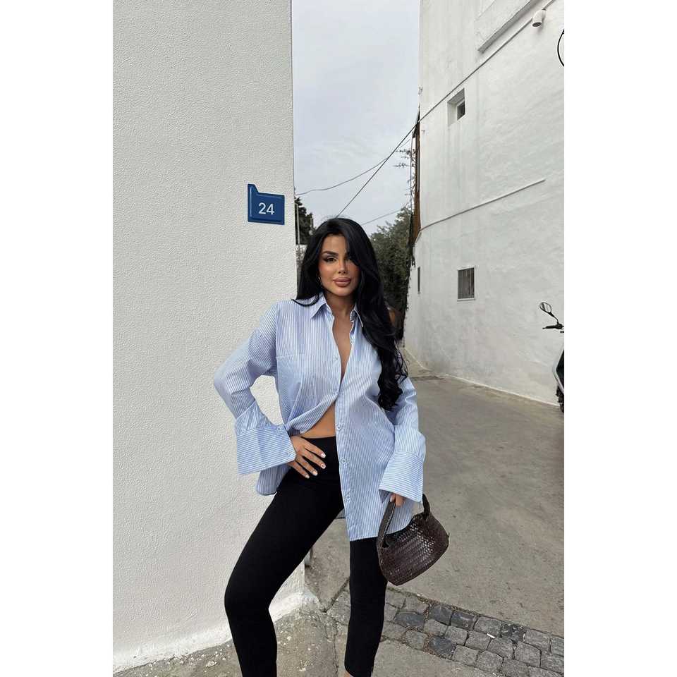 Hauts pour femmes en coton et mousseline rayés à col montant bleu Romi, coupe décontractée, tailles XS-XL, pour le bureau, les fêtes, les saisons automne et printemps