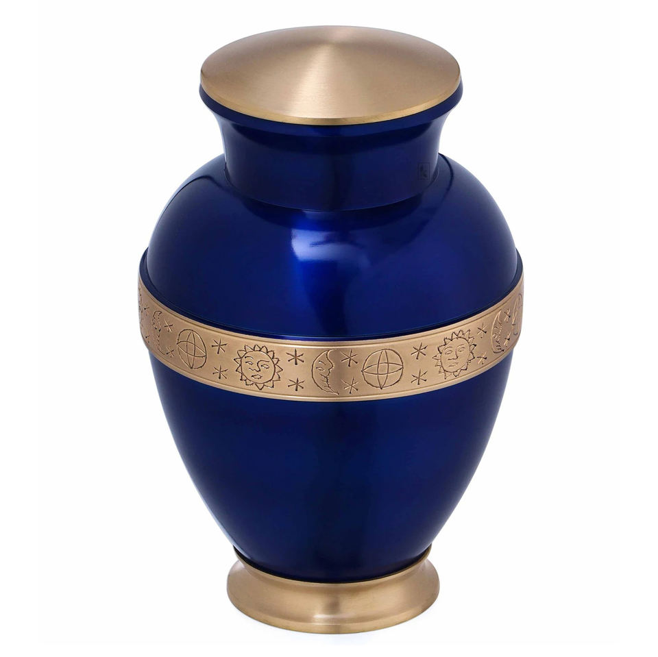 Blue Shining Brass Cremation Urn Golden Engraved Band Adult Human Ashes Funeral Jar Decorative Keepsake Urns Exporter Wholesale