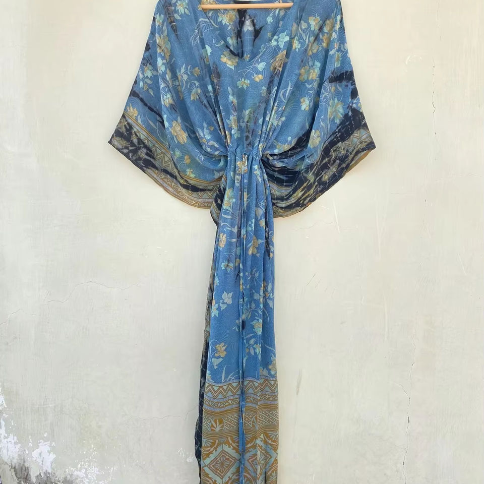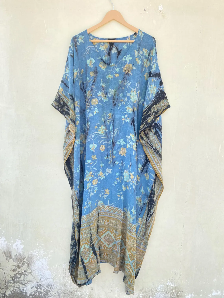 Blue Silk Kaftan Robe with Indian Tie-Dye Design Smooth for Daily Life Wear in Autumn Spring Summer