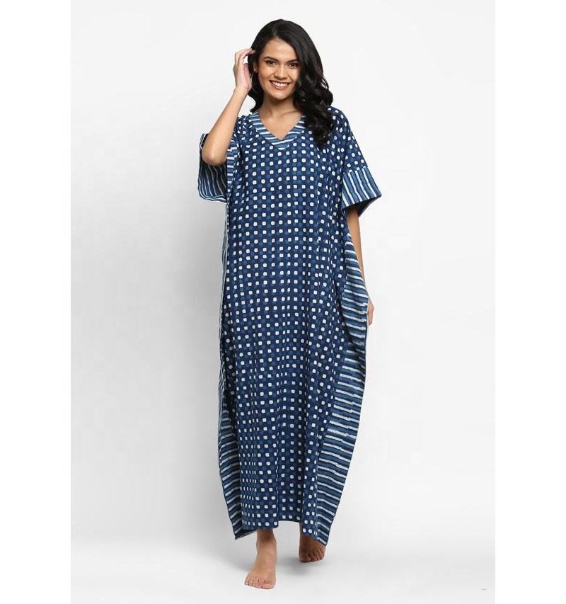 Rayures bleues et cubes blancs bloc à la main imprimé col en v coton caftan robe de nuit parfaite pour femmes pour les faiblesses paresseuses
