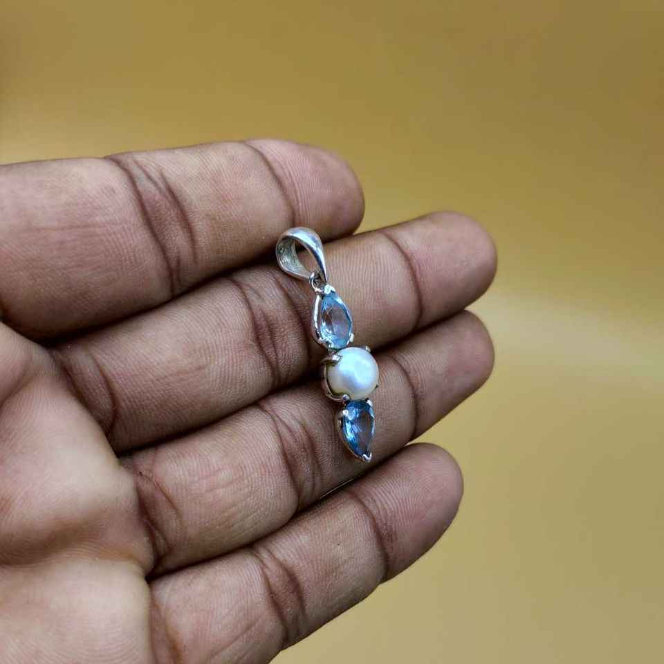 Blue Topaz And Pearl Prong Set Rare 925 Fine Silver Bohemian Designer Pendant Artisan Crafted Handcrafted Natural Stones
