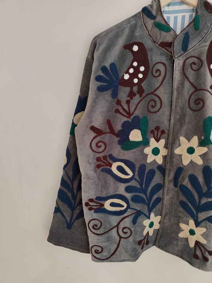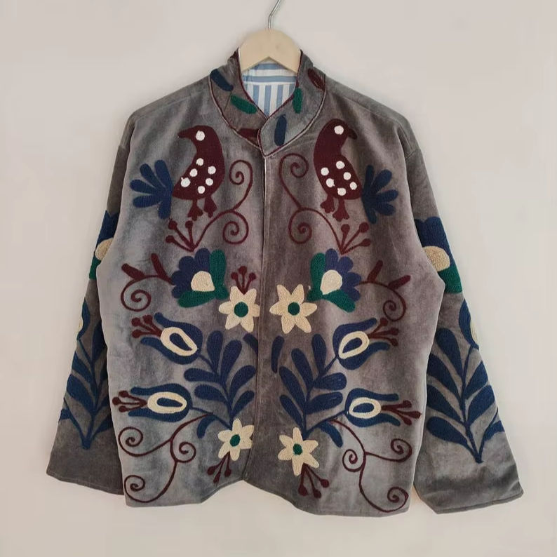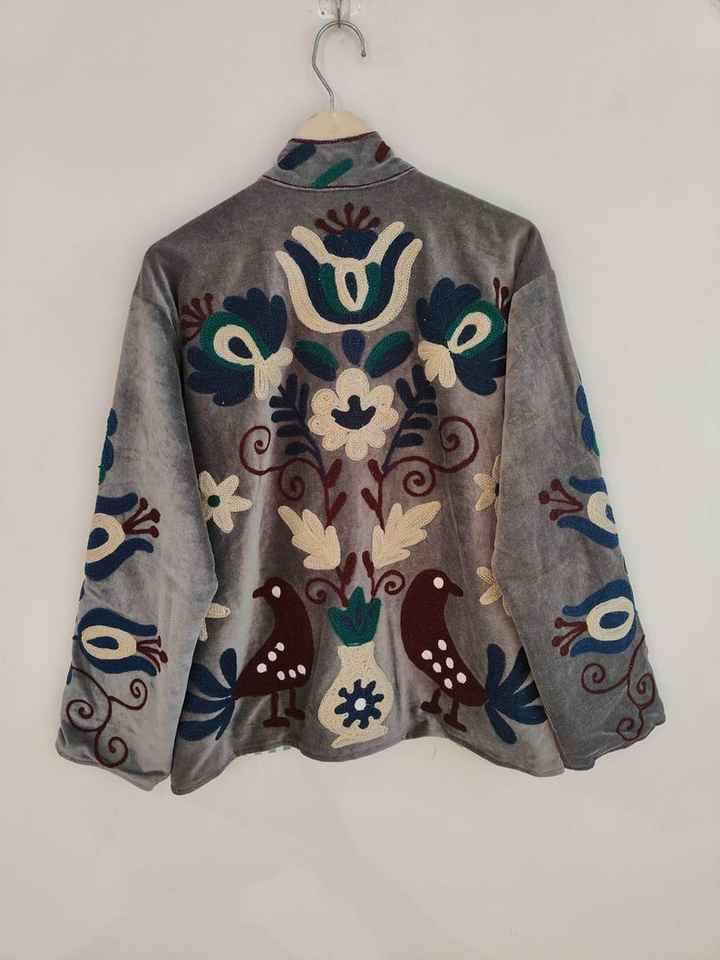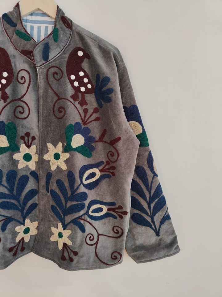 Veste en velours bleu brodée Suzani, manteau bohème en velours, veste artisanale colorée en velours, vêtement d'extérieur unique d'art populaire