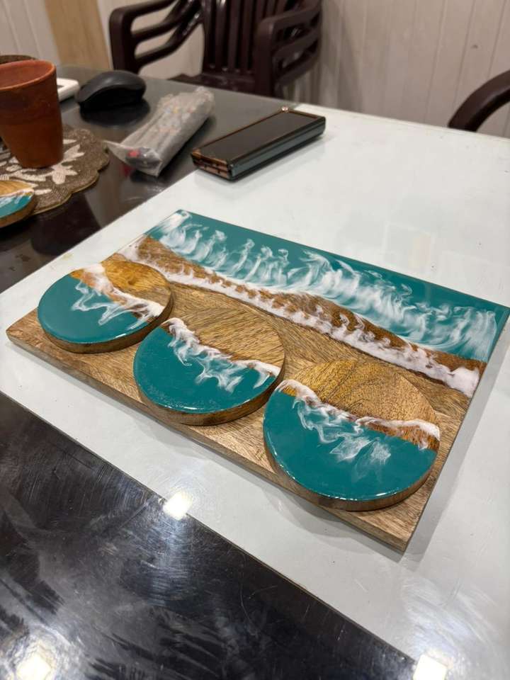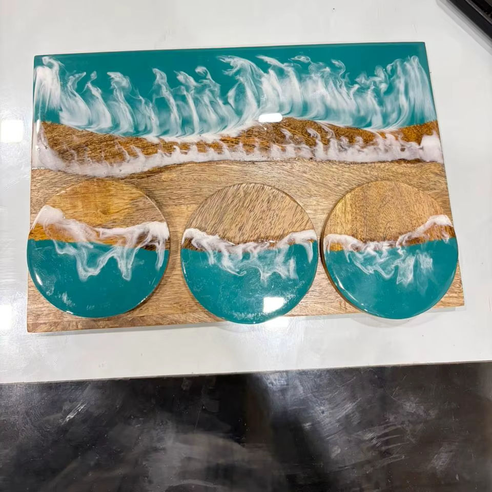 Planche à découper en résine à motif vague bleue, planche à fromage et à charcuterie artisanale, planche de préparation des repas en résine et en bois, vente