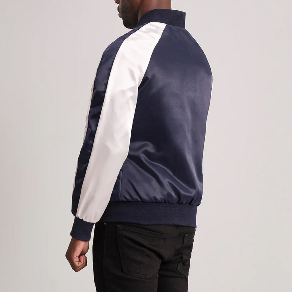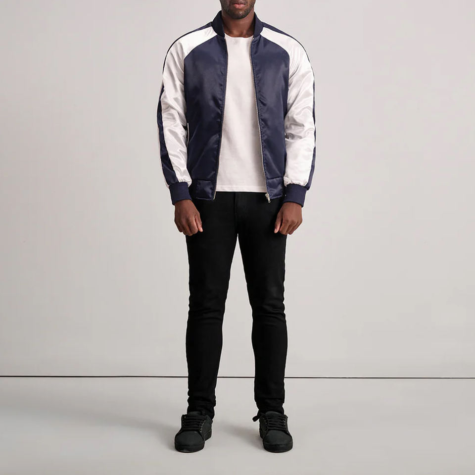 Bleu blanc hiver Varsity veste Satin matelassé Polyester doublure fermeture à glissière col montant côtes tricot poignets
