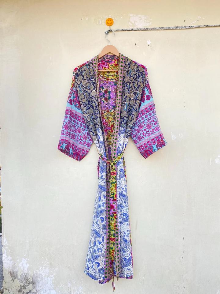 Kimono long en soie réversible bleu exclusif pour femme Robe élégante-Été Automne Printemps Saison-Soie recyclée