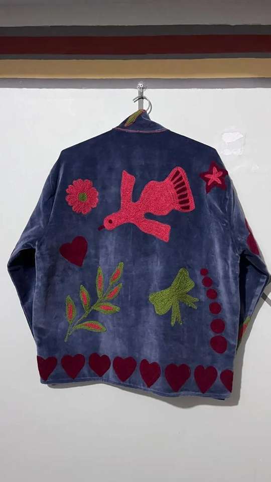Manteau bleu et veste en velours brodée à la main, style bohème Suzani, motif oiseau