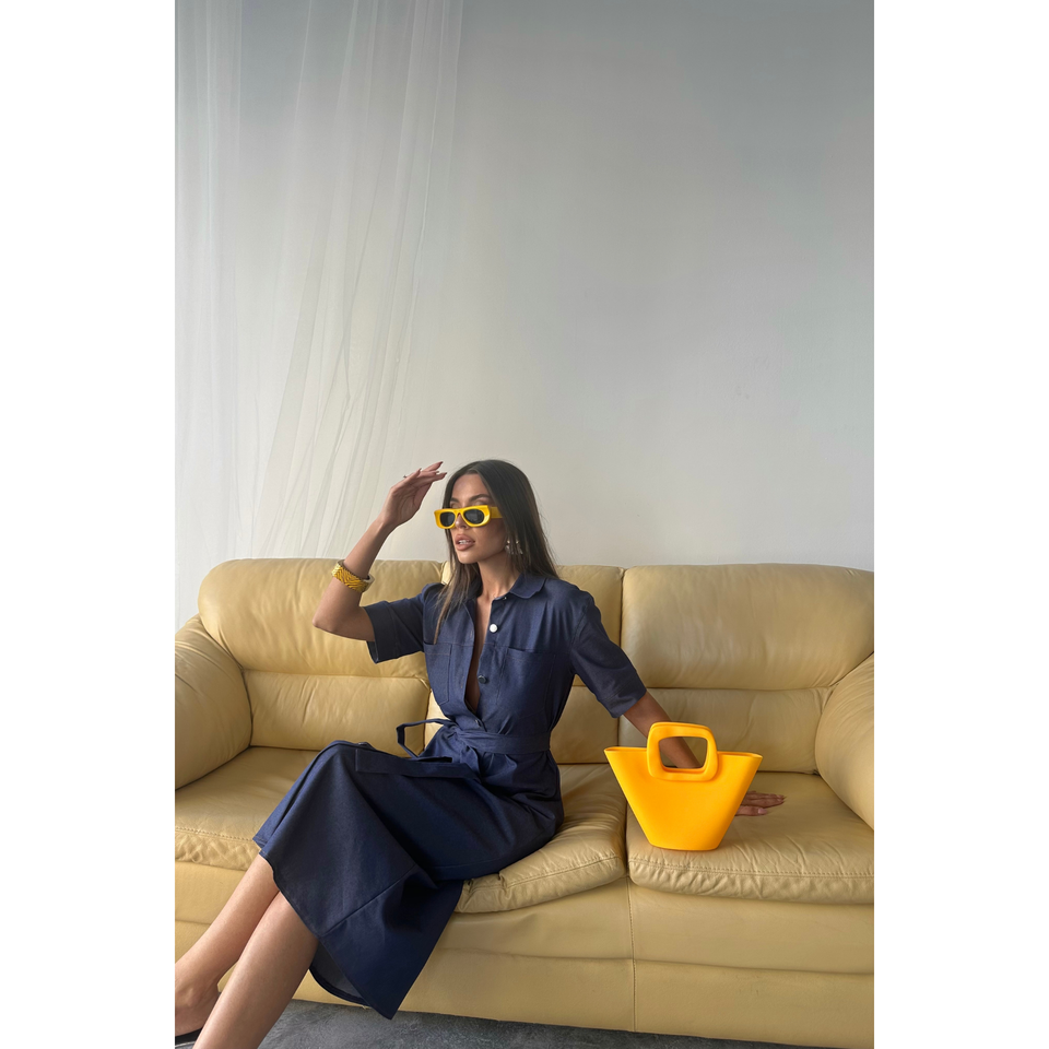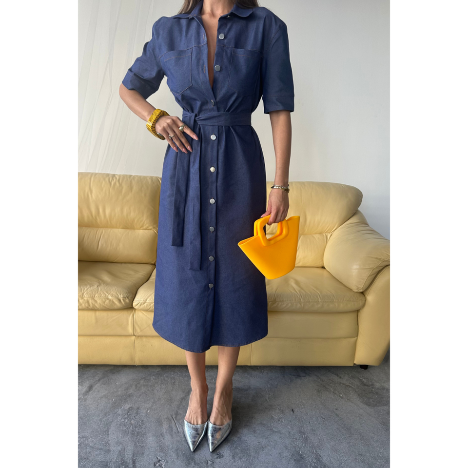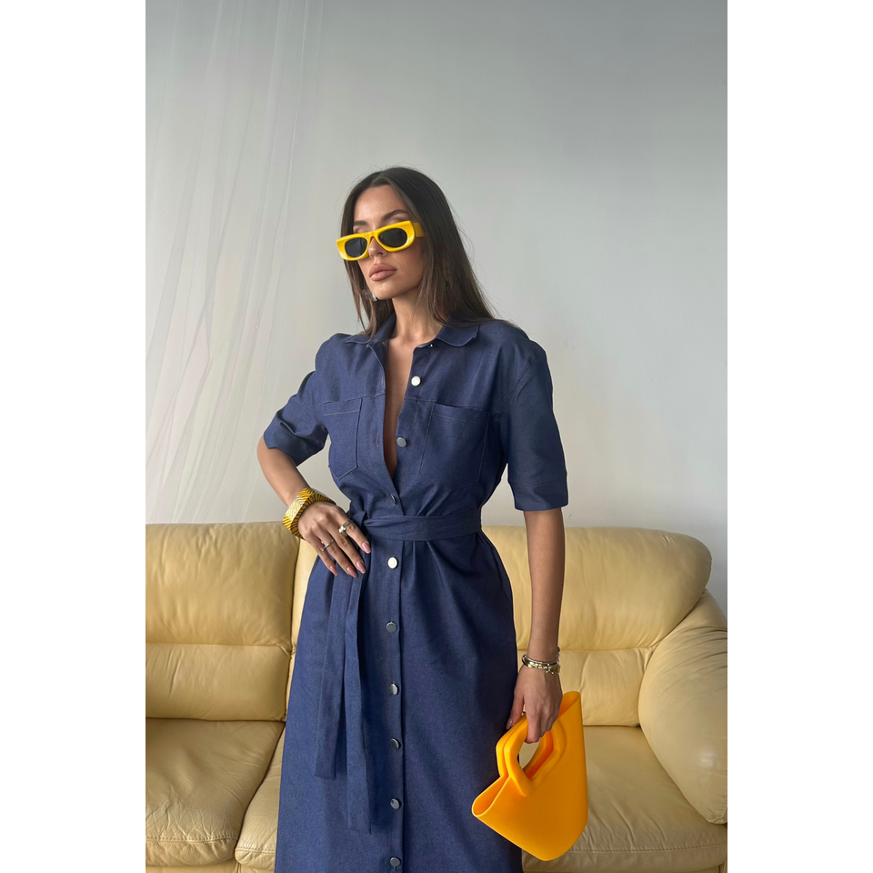 Robe de soirée bleue en Tencel à manches courtes boutonnée devant