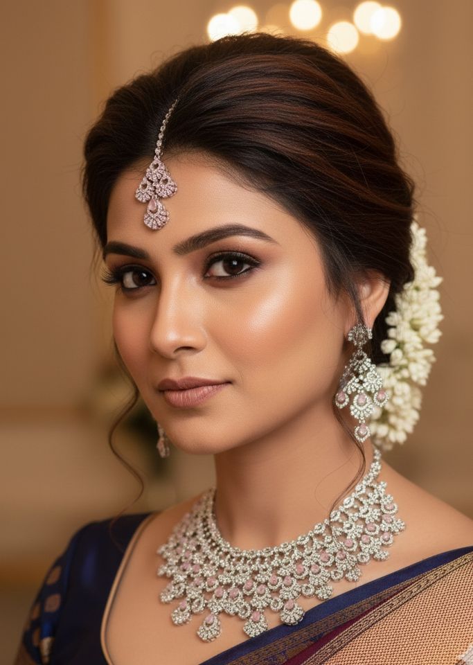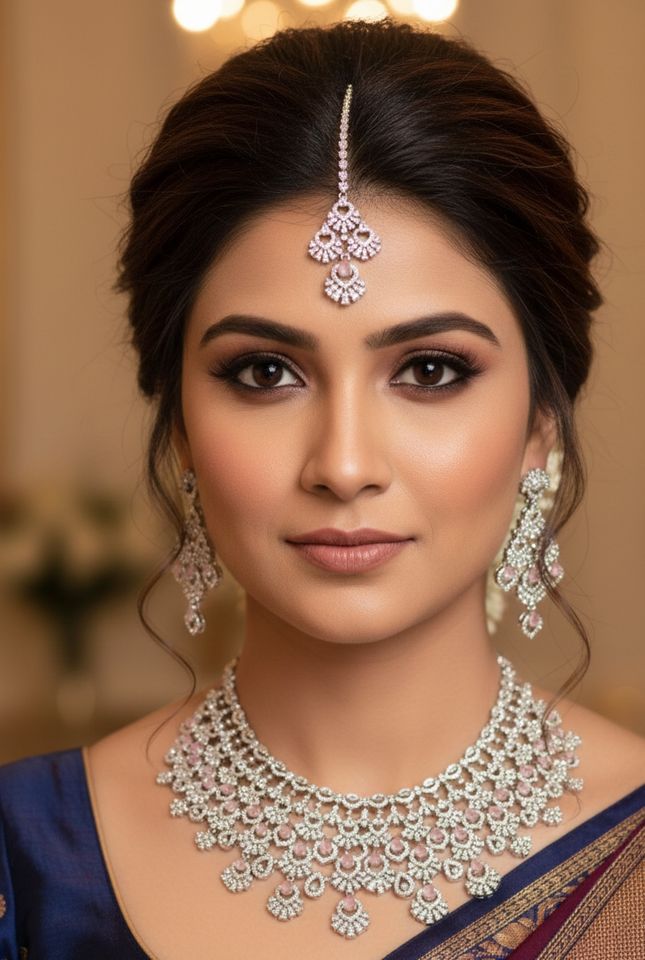 Blush diamond royale necklace earrings & maang tikka Set crafted with premium blush pink diamond cut stones