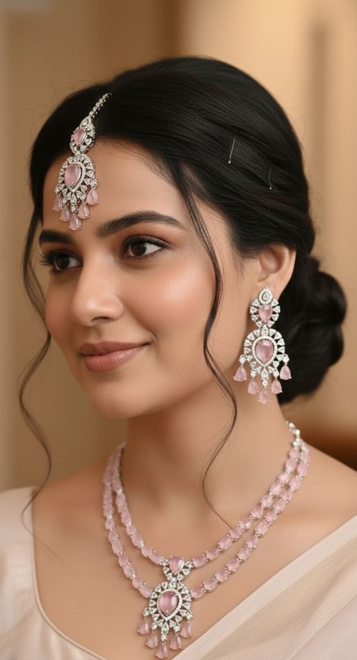 Blush pink kundan royale necklace earrings & maang tikka set made of remium blush pink pear and oval cut stones