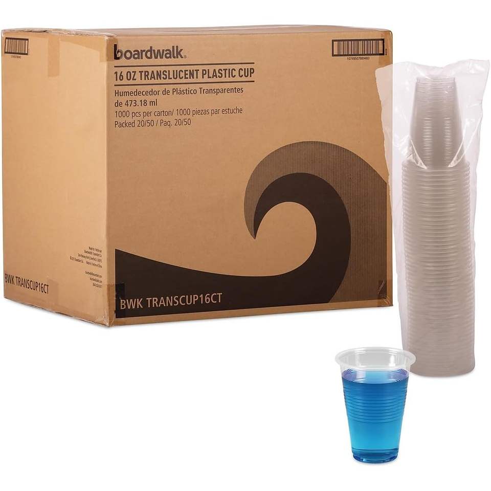 Gobelets en plastique translucide jetables Boardwalk 16oz pour boissons froides, 50 gobelets/sac, 20 sacs/carton, 20 cartons/caisse