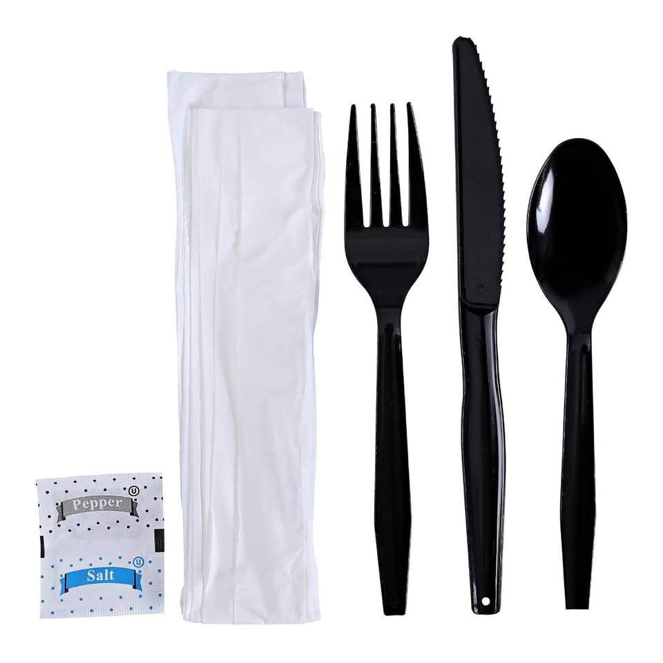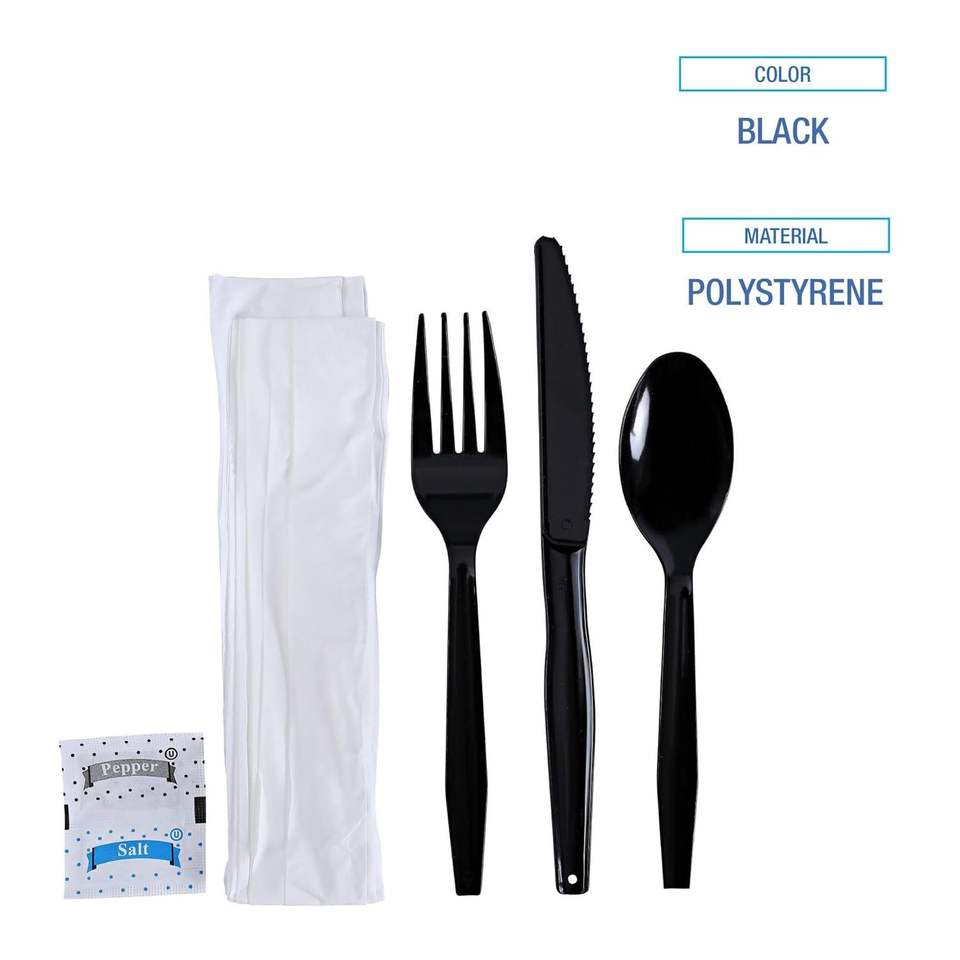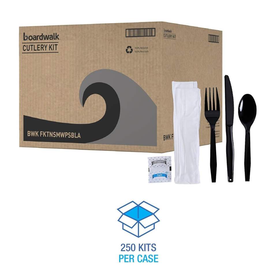 Kit de couverts en papier et plastique six pièces Boardwalk noir (fourchette/couteau/serviette/cuillère à café) 250/carton