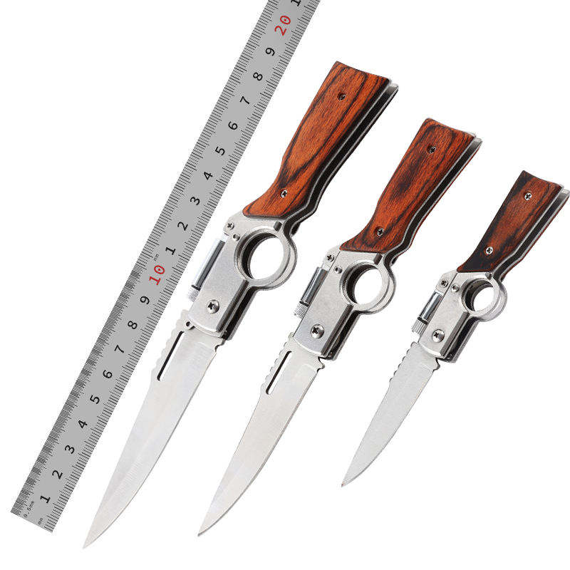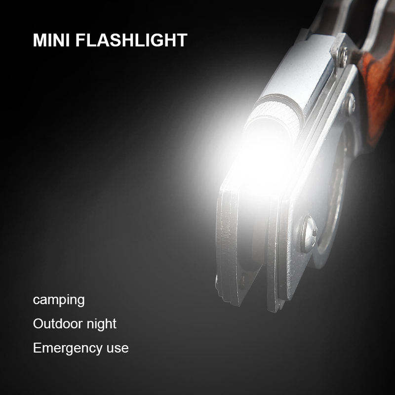 Bochen Couteau de Poche Tactique Pliant avec Lampe LED, Mini Torche, Protection Extérieure, Outil Multifonctionnel et Manche en Bois Gravé