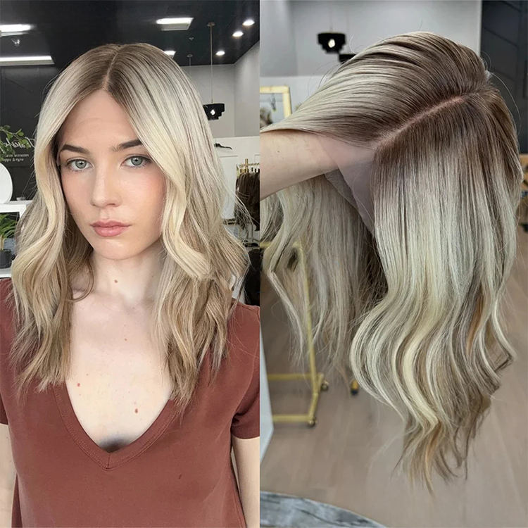 Perruques courtes ondulées avec racines brunes et mèches blondes # Perruques courtes sans colle 613 Full Lace et perruques Lace Front 13x4