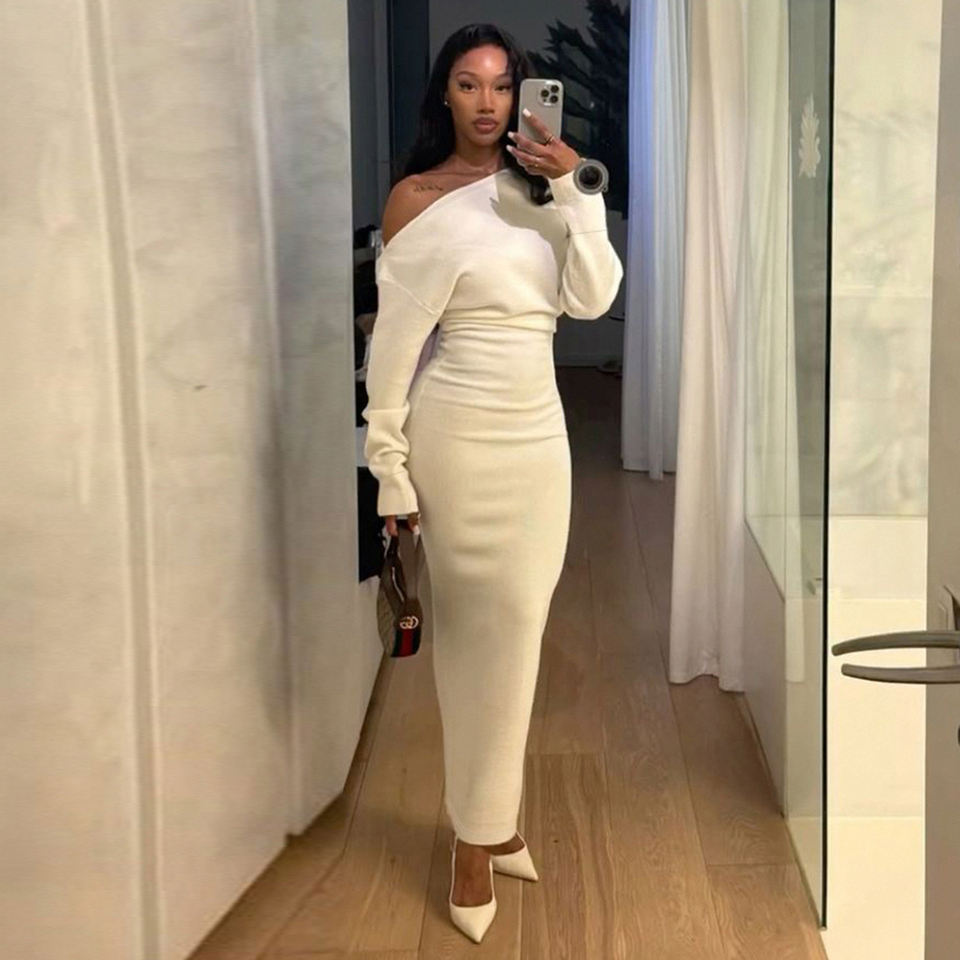 Robe longue moulante à manches longues pour femmes, épaules dénudées, couleur unie, printemps automne, robe longue, style doux, chaude, élégante, robe de soirée