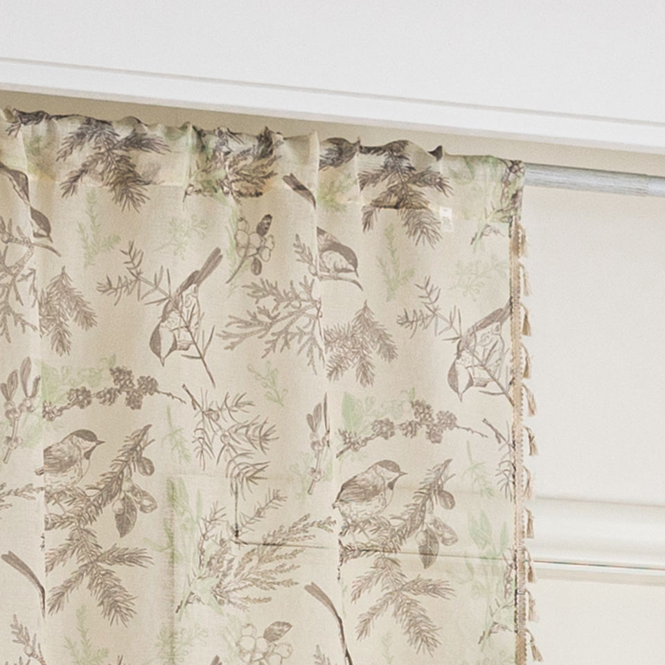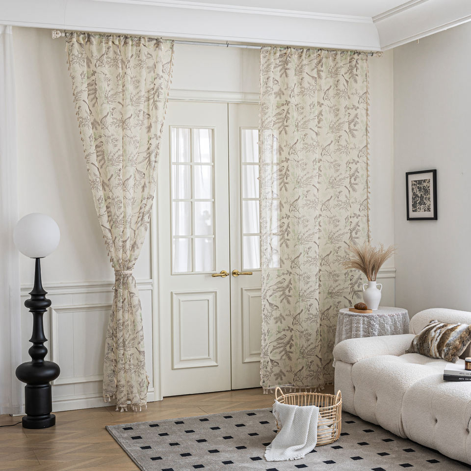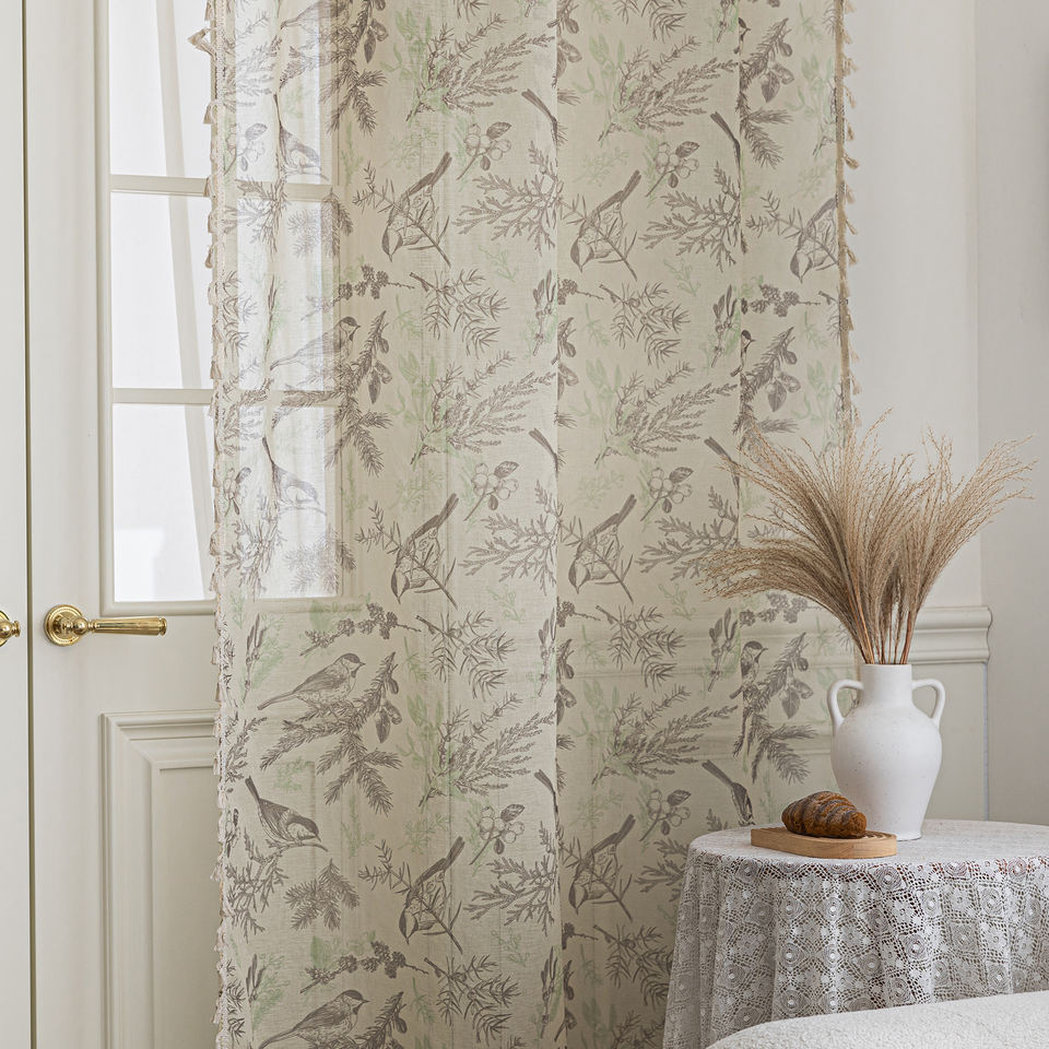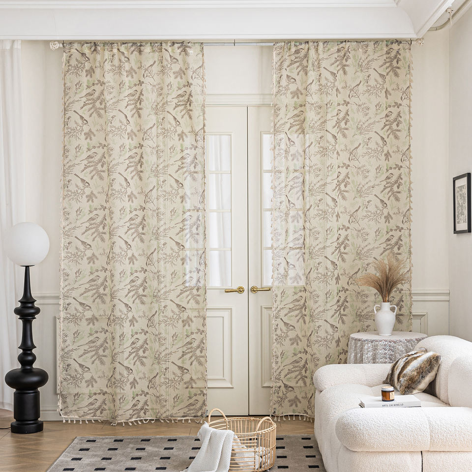 Rideaux transparents oiseau bohème 100% polyester-Moineaux et vignes peints à la main, glands fluides pour chambre/balcon/café