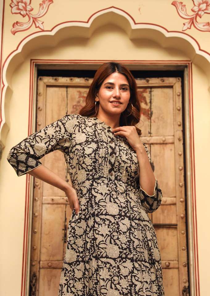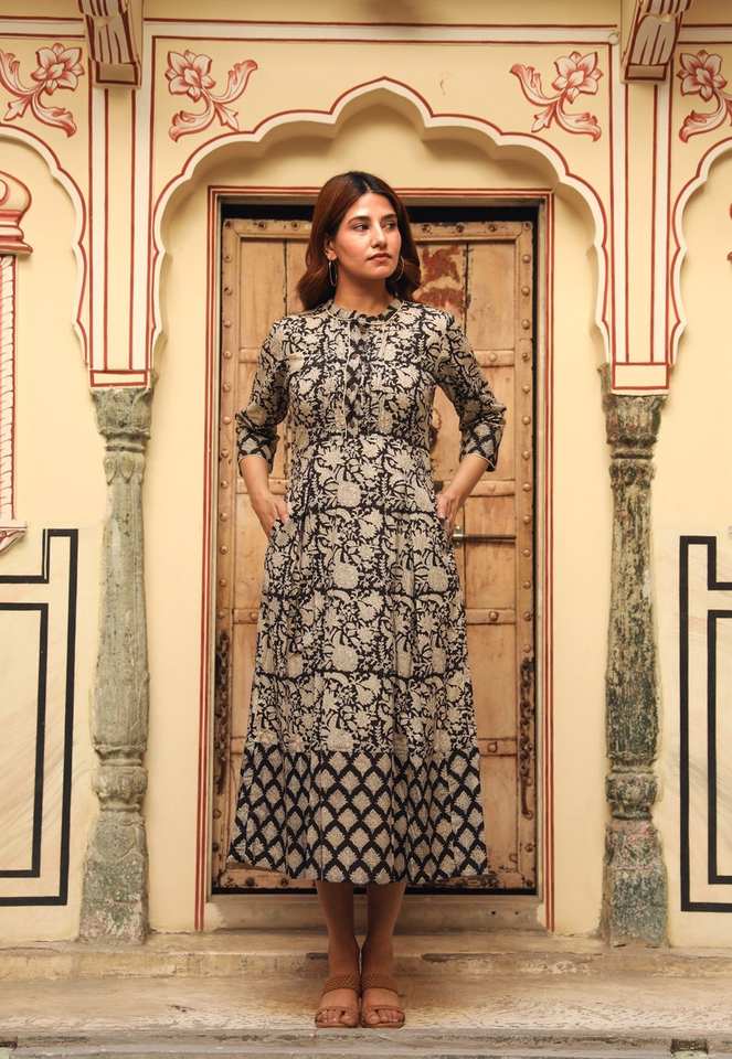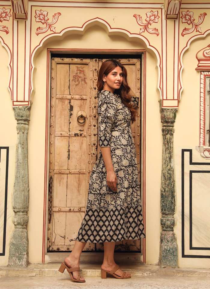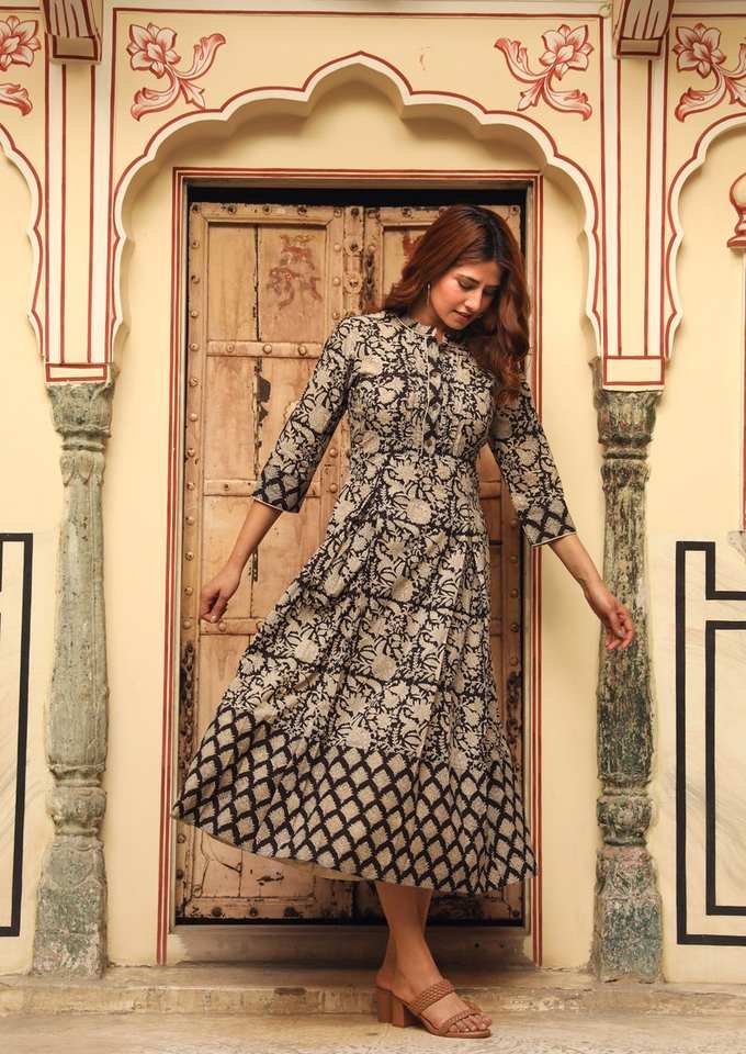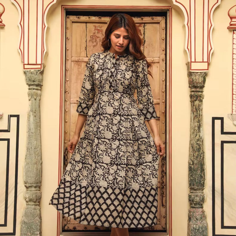 Bohemian Brenna Dress A Line Calf Length Hand Block Printed Pure Cotton Black Cream Ethical Fashion