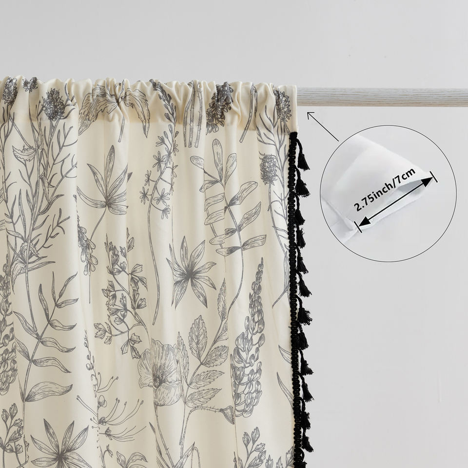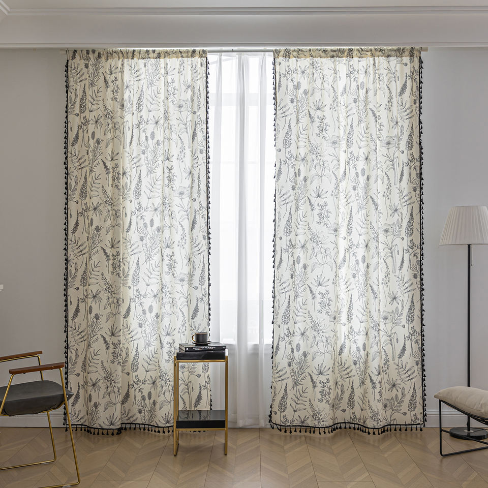 Rideaux transparents en polyester crème bohème avec imprimés botaniques gris glands noirs motif végétal fluide pour décor de chambre à coucher de salon
