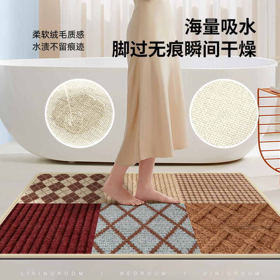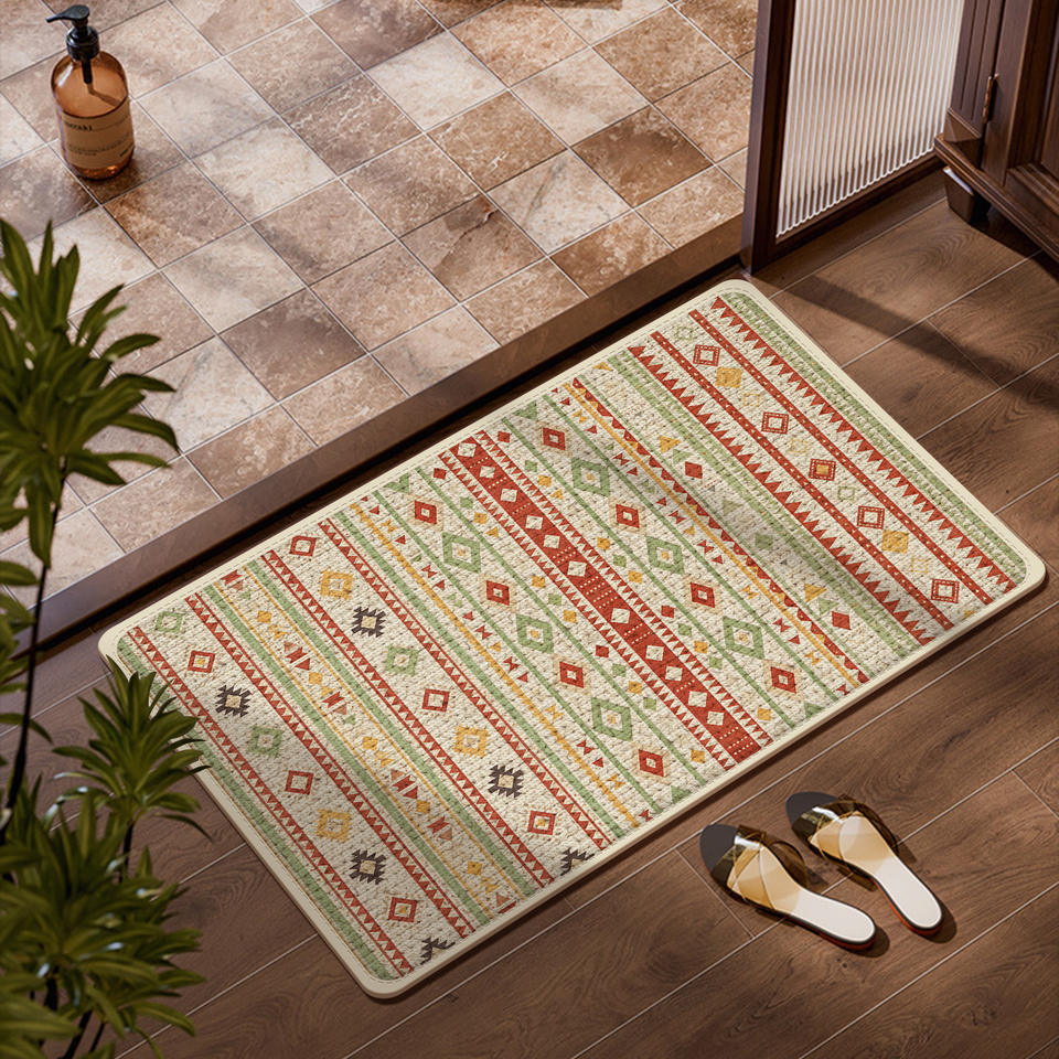Tapis de salle de bain rectangulaire géométrique bohème en imitation lin, absorbant, antidérapant, épaissi, résistant aux taches, beige