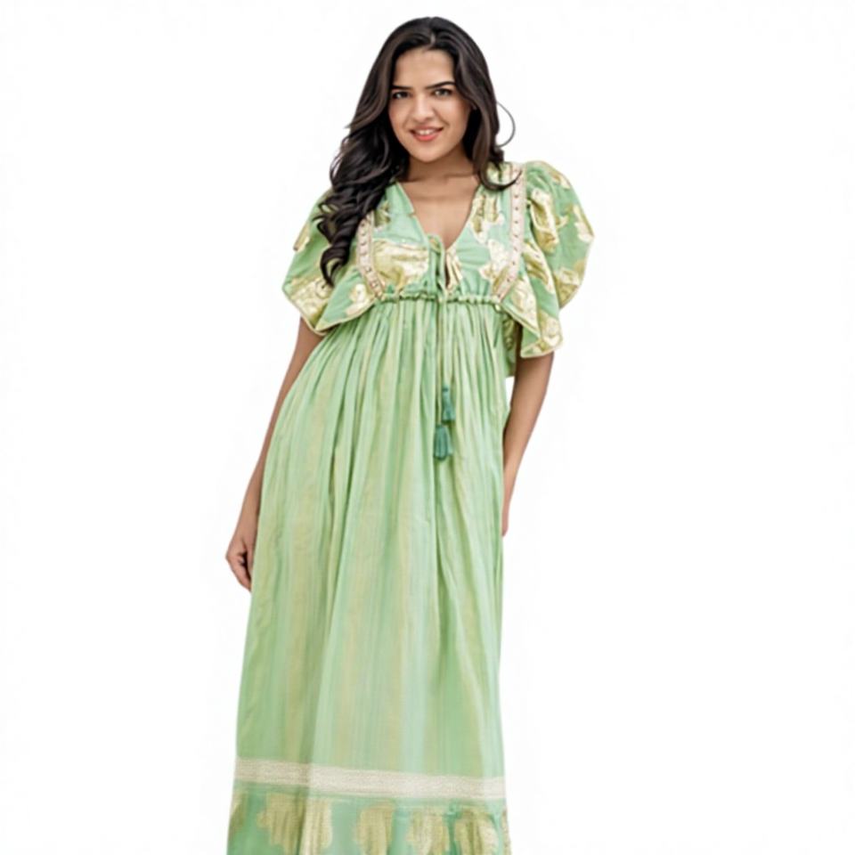 Bohemian Green Gold Digital Print Midi Cotton Flowy Indian Summer Dress Elegant Resort Vacation Wear Gown A-Line