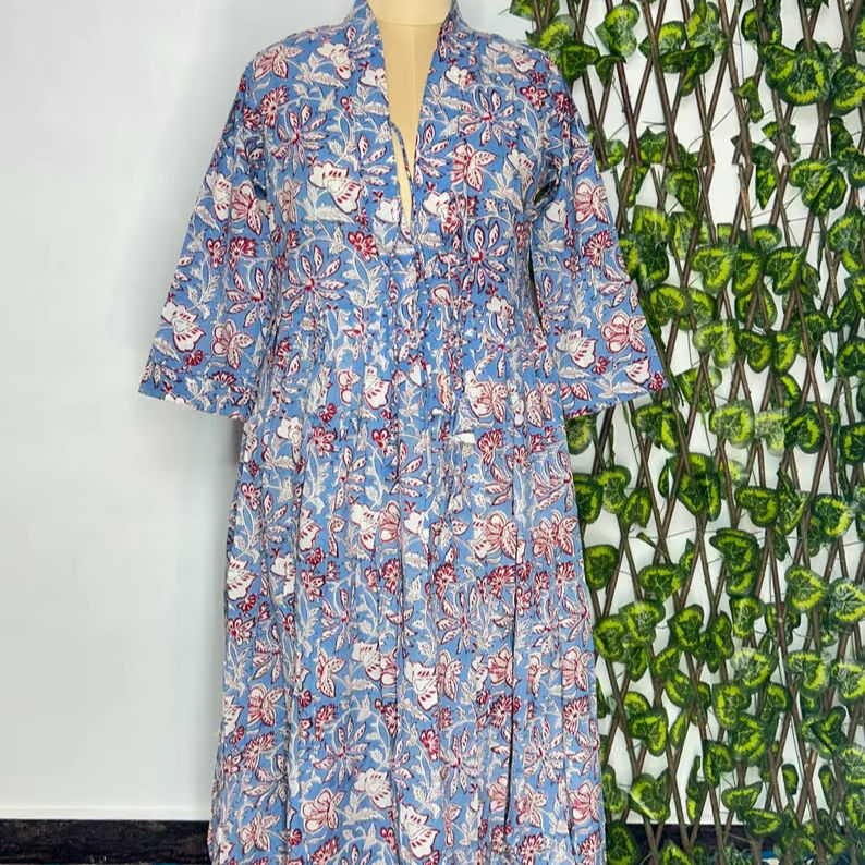 Bohemian Kimono Dress Hand Block Printed Floral Cotton Casual Women Dress