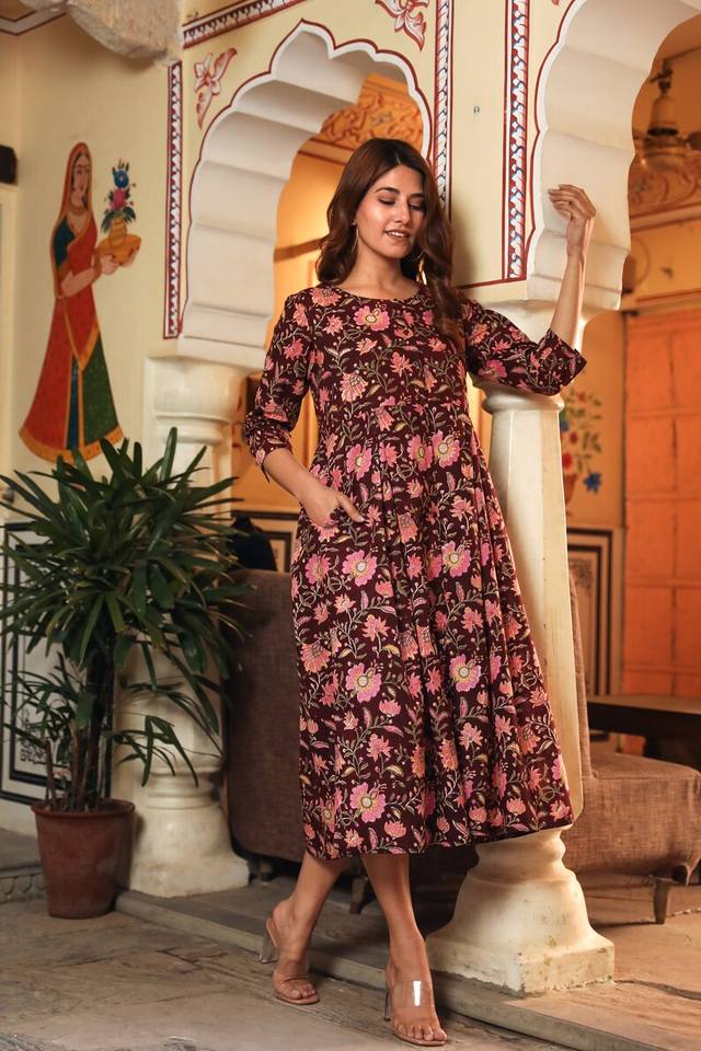 Robe boutonnée bohème Lyanna, imprimée à la main, en coton, marron, rose, robe d'été