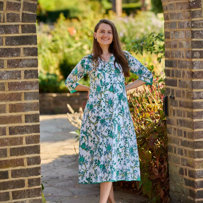 Bohemian Peacock Dress Calf Length Hand Block Printed Floral White Green Casual Occasional