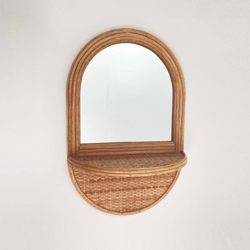Miroir mural bohème en rotin avec étagère pour couloir, salle de bain et décoration de bureau à domicile, miroirs en rotin vintage du Vietnam