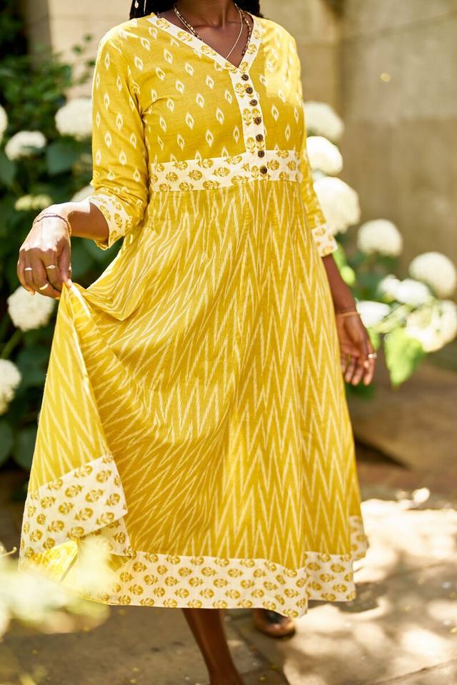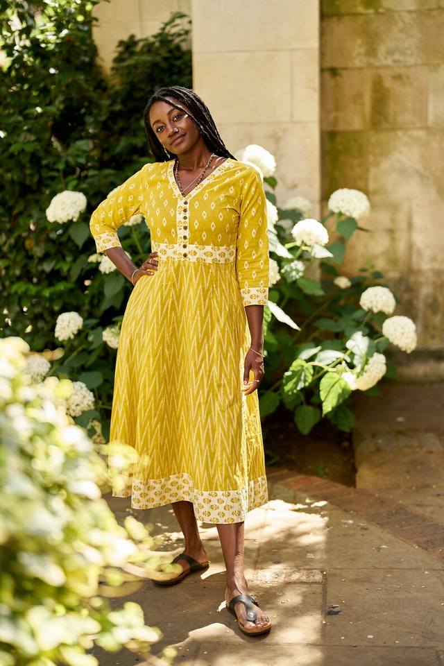 Robe Bohème Soleil Imprimée à la Main en Coton Pur Tenue Décontractée Occasionnelle Vacances d'Été Faite à la Main