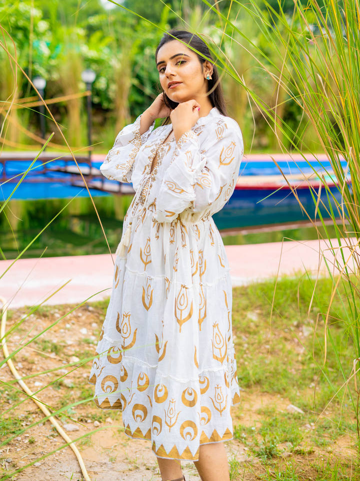 Bohemian White Midi Cotton Floral Print Summer Dress Lightweight Casual Washable A-Line Resort Wear
