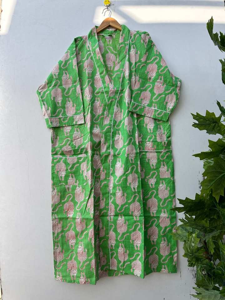 Robe kimono longue en coton 100% à imprimé animalier bohème, faite à la main, col en V, pour la plage, tenue décontractée pour femmes, été