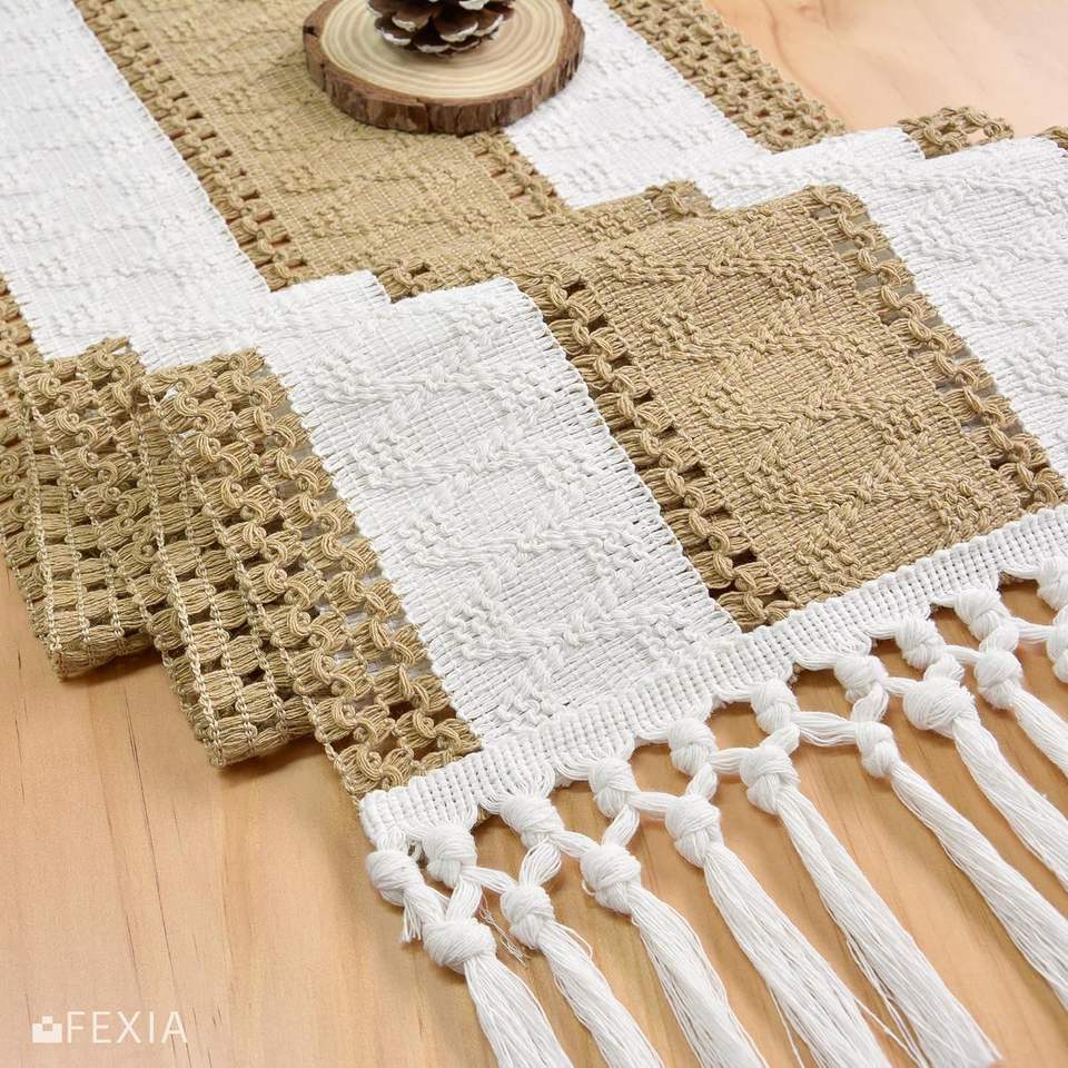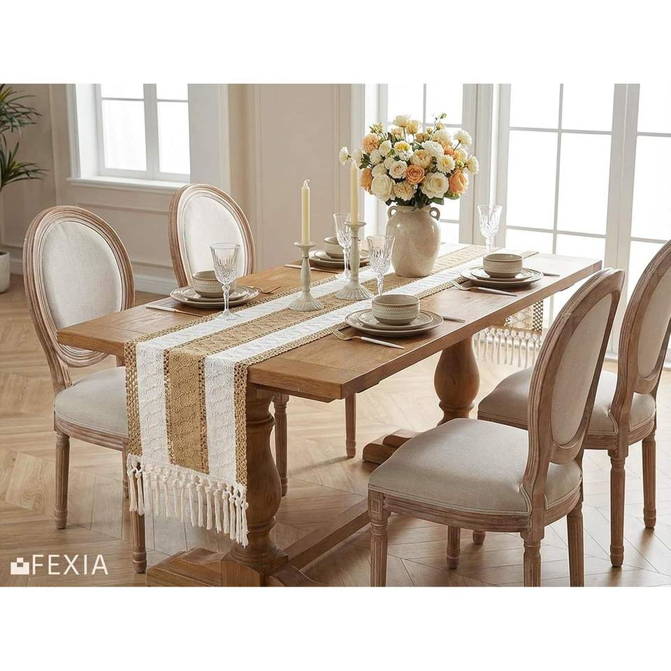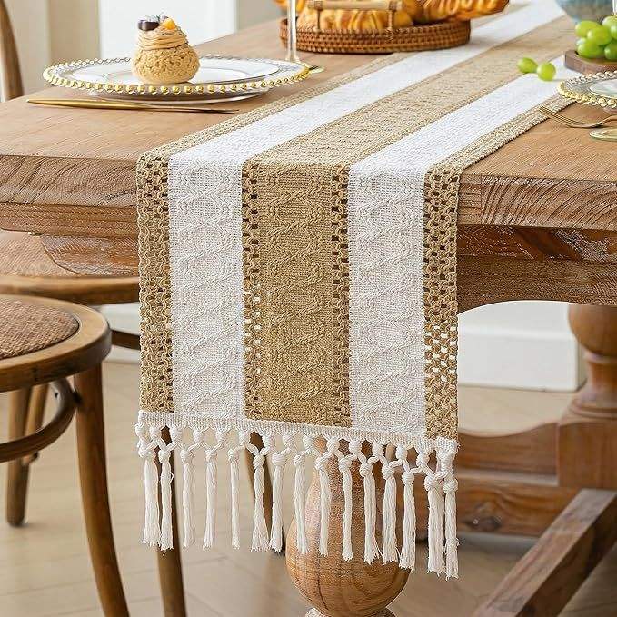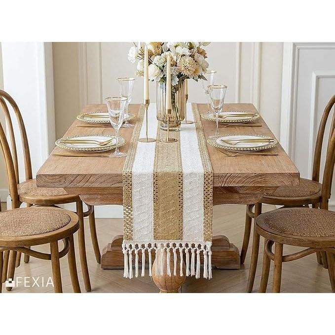 Chemin de table en macramé et toile de jute style bohème chic avec pompons, décoration rustique pour salle à manger et salon de ferme
